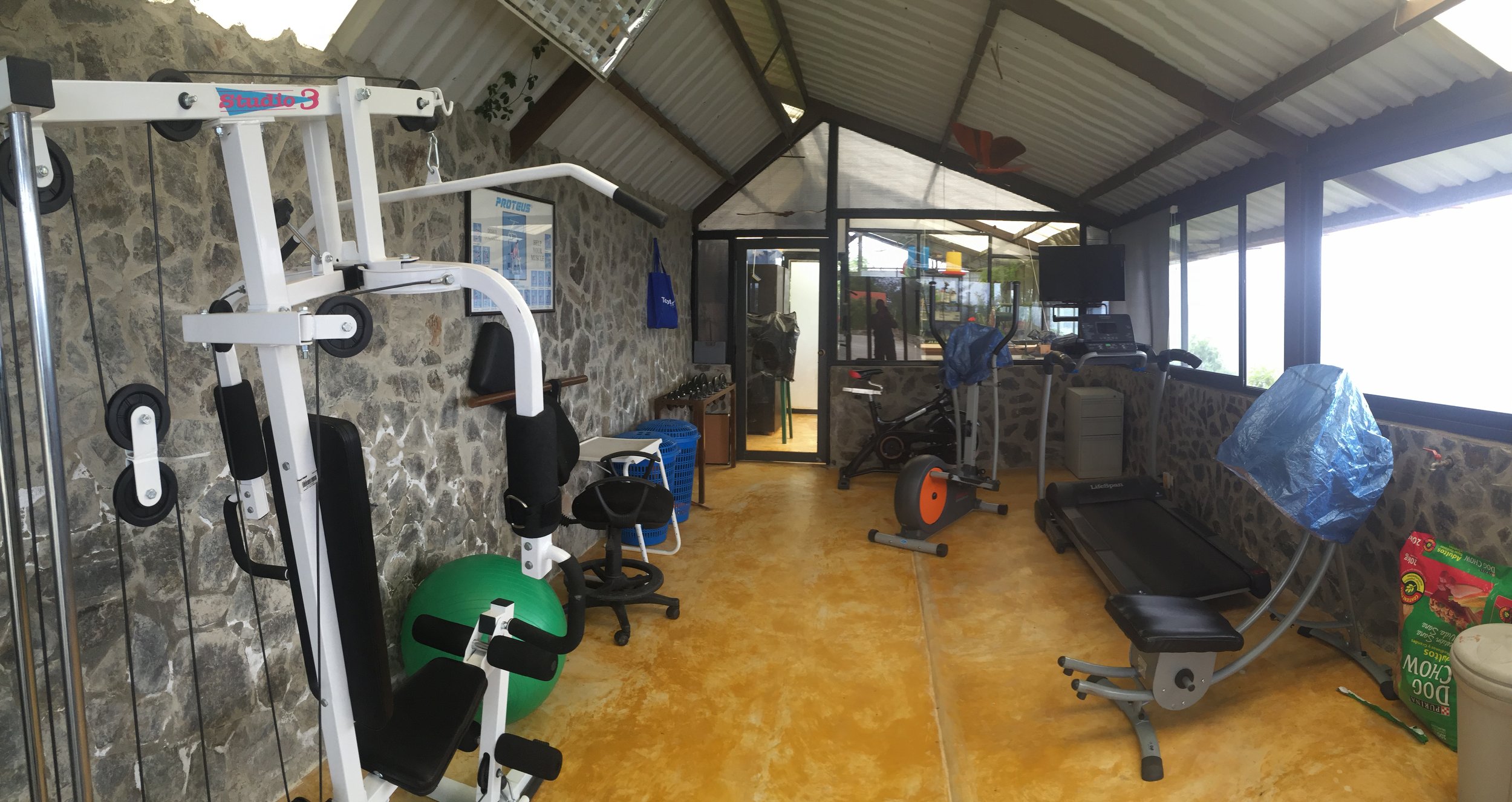 Un pequeño gimnasio equipado con máquina multifuerza, caminadora, elíptica y bicicleta estática, i